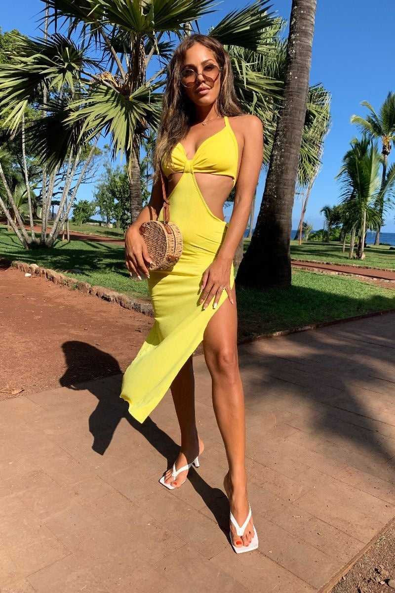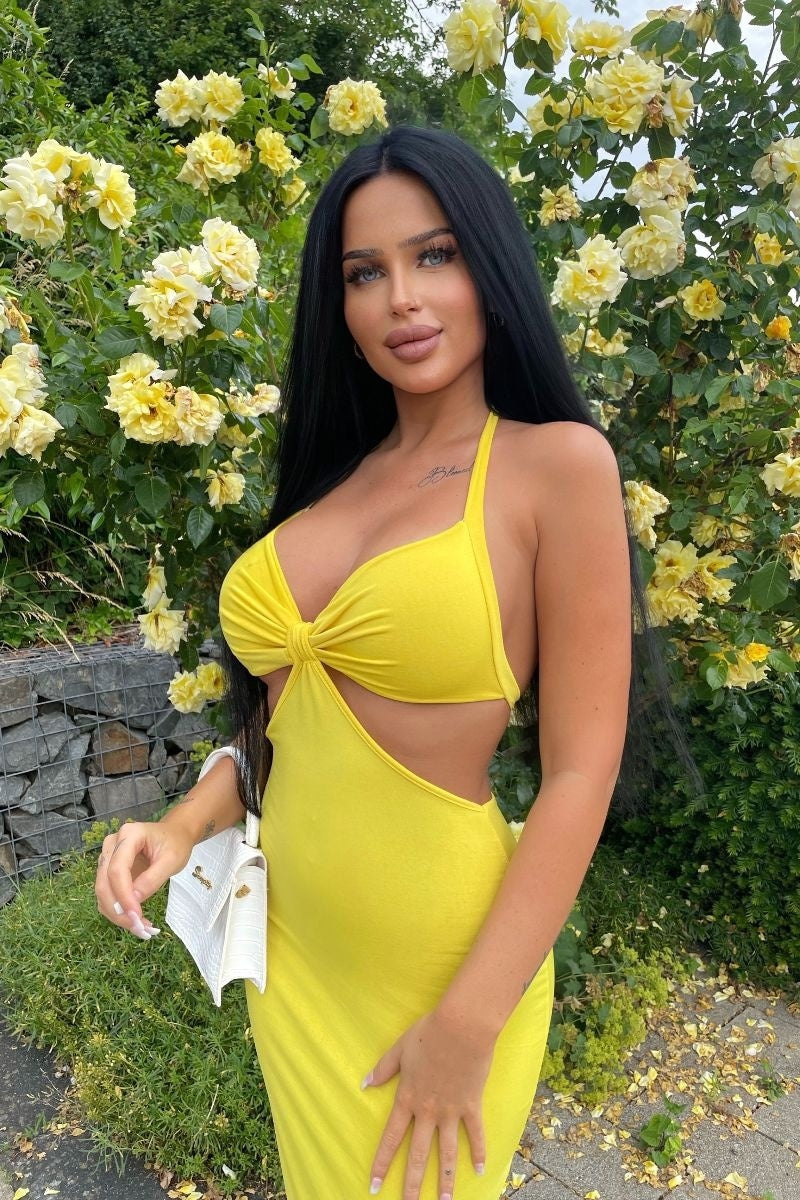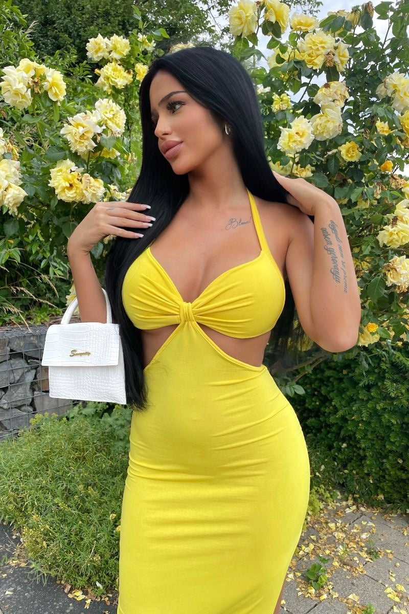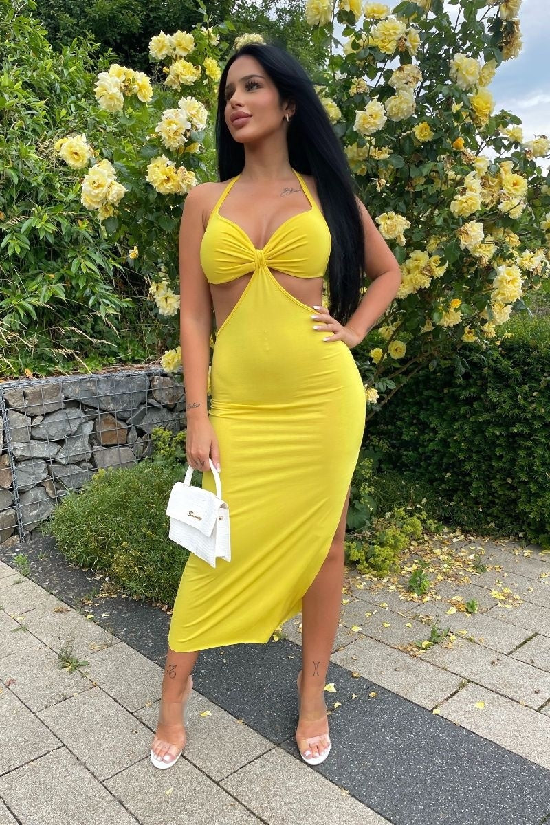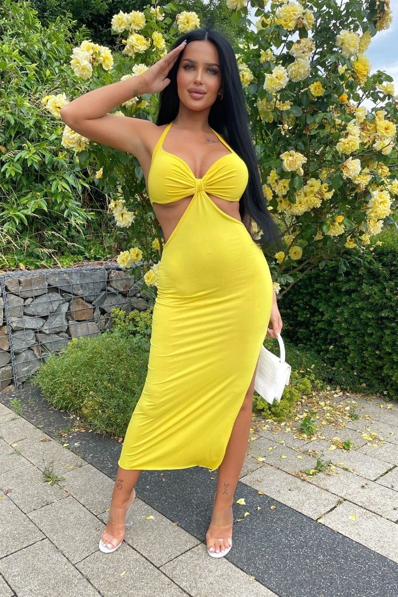 Deze zomerse maxi-jurk met halternek en uitgesneden taille in de prachtige kleur geel zal gegarandeerd de aandacht trekken. Stijl de jurk met hakken of slippers om de look af te maken!