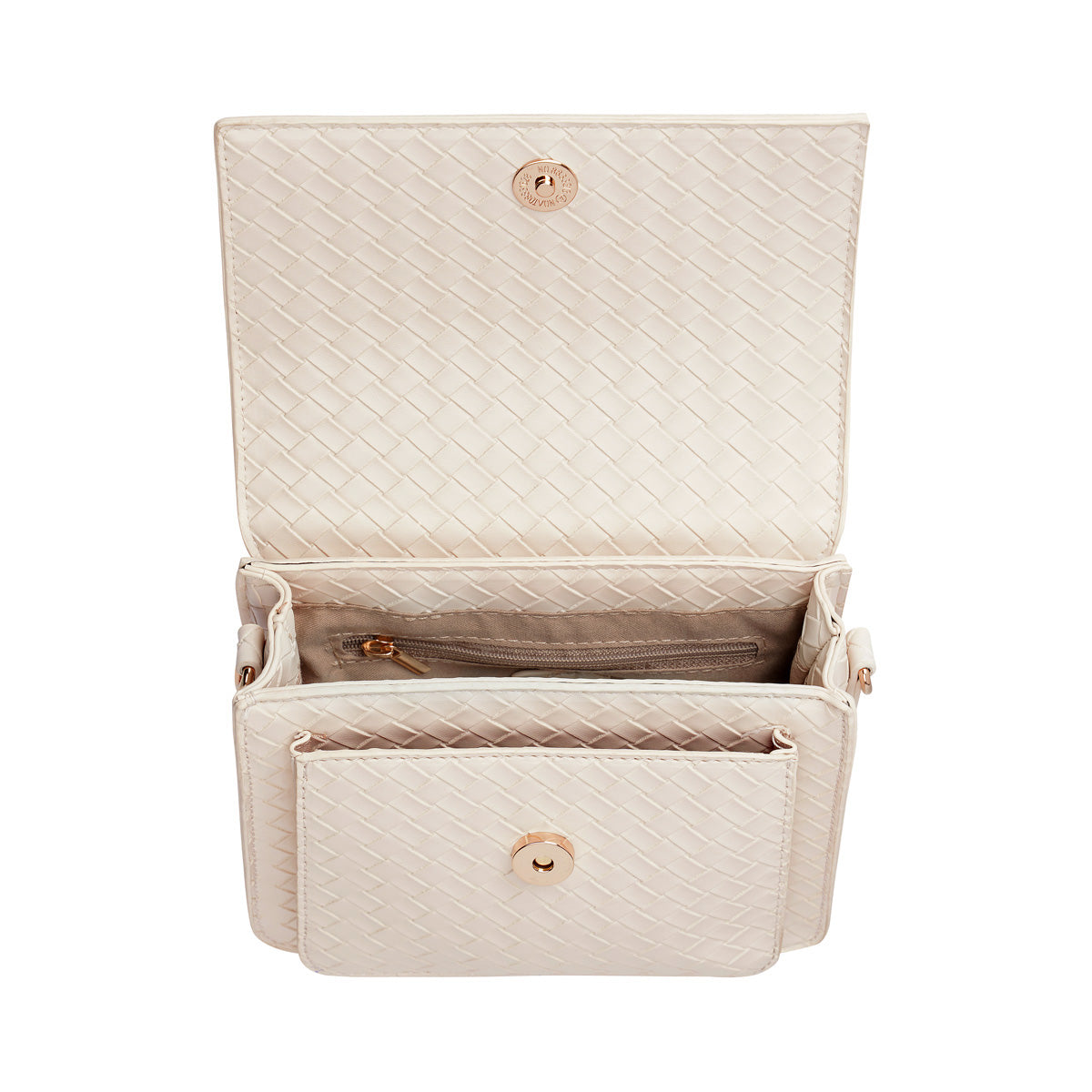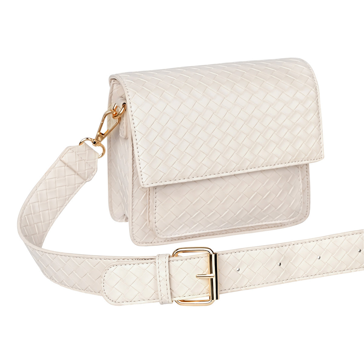 De gevlochten schoudertas heeft een afneembare schouderband en een magneetsluiting. Deze tas is ook verkrijgbaar in het roze, blauwpaars en zwart.